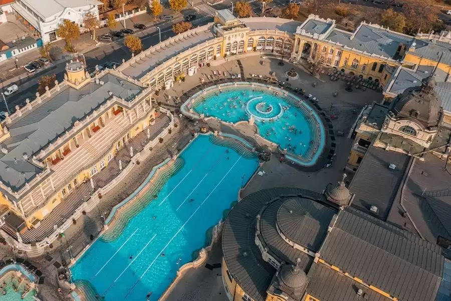 Széchenyi Baths is one of Europe's largest spa complexes, housing 21 indoor and outdoor pools, as well as 10 saunas. The medicinal water emerges from Budapest's second deepest well at a temperature of 76 degrees Celsius. The adventure pool features a lazy river, underwater bubblers, neck showers, and water jets hidden within seating benches, providing a soothing back massage. In addition to traditional medical treatments, the spa offers various wellness services, including a fitness room, sauna usage, aerobics, and water aerobics.